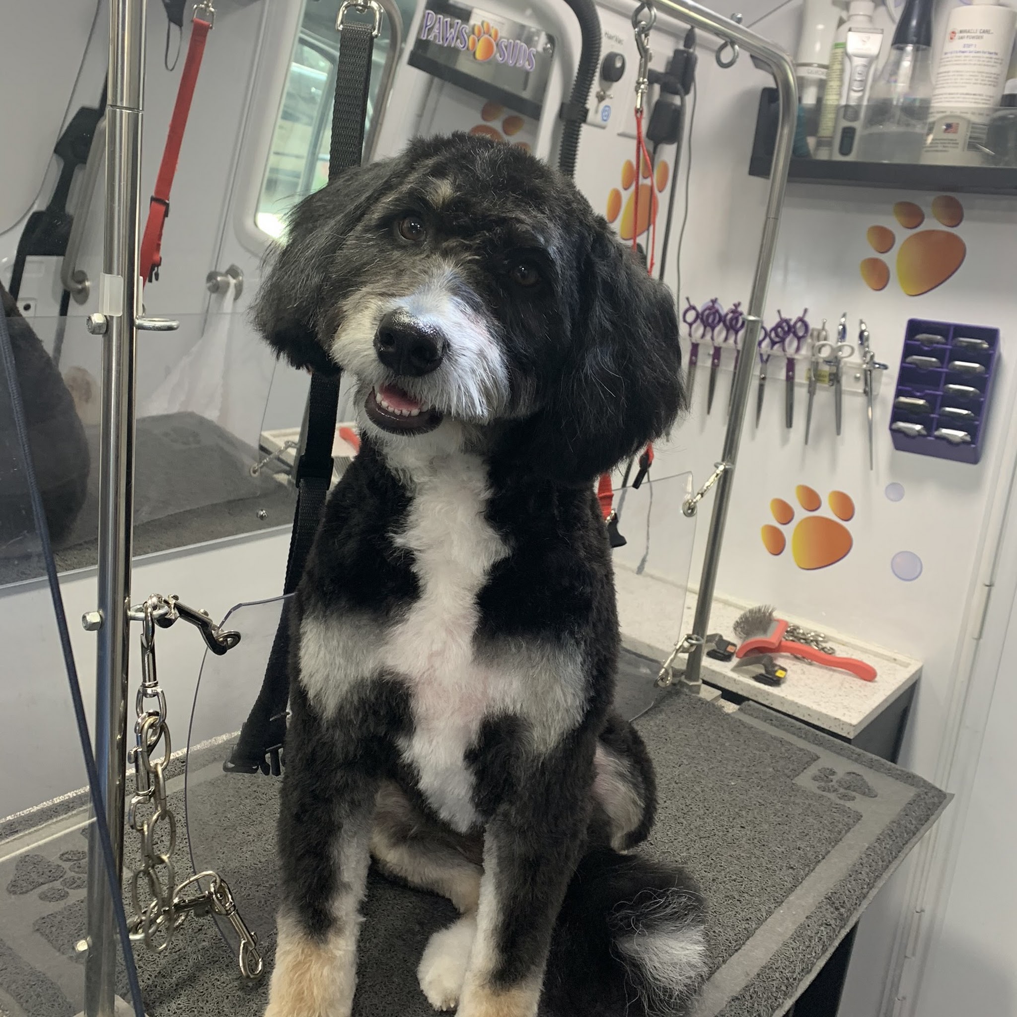 This was our first time using a mobile pet grooming service. Santiago was knowledgeable and very kind. The cut was quick and adorable. Safe to say we are hooked. Thank you Paws and Suds!!!!!
