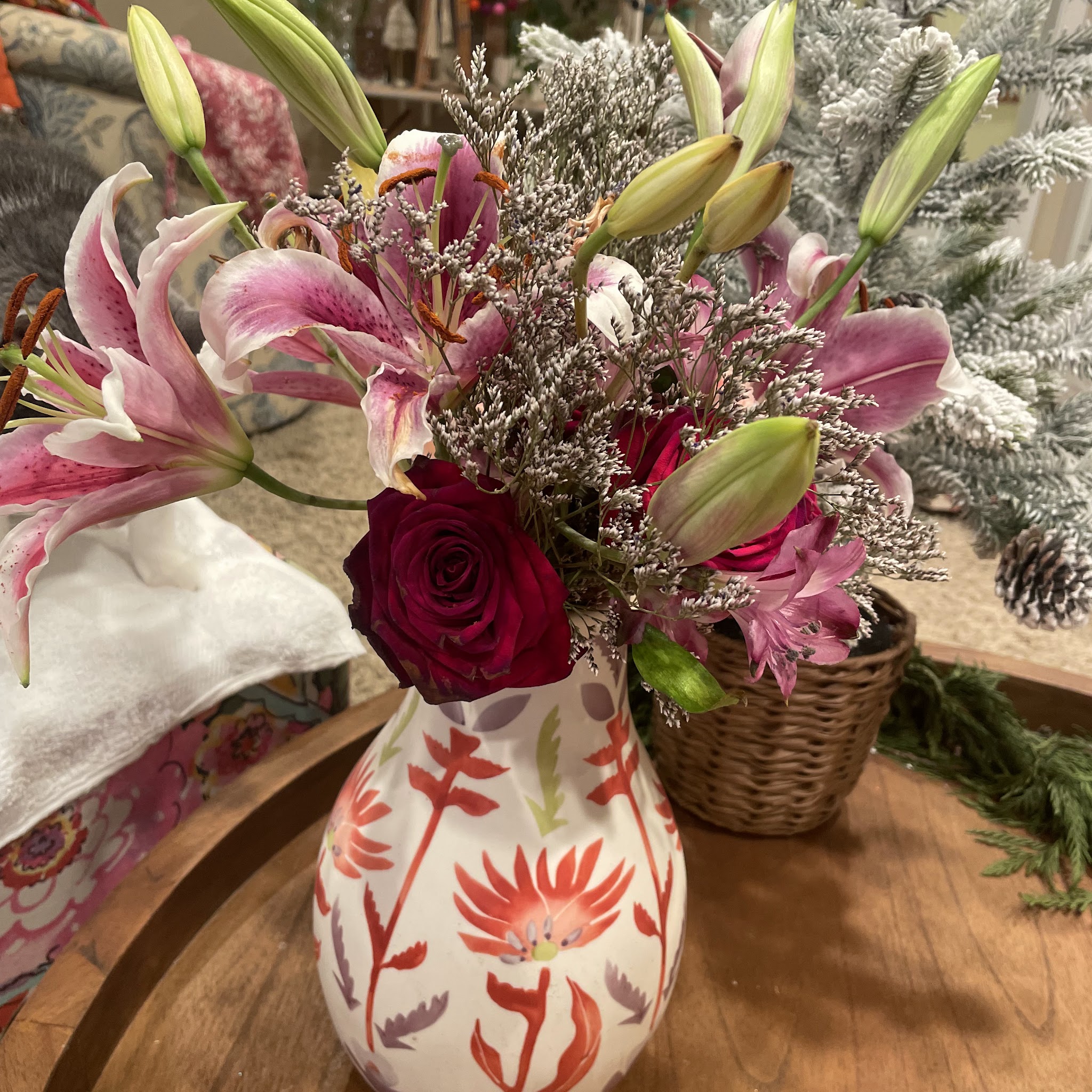 My first winter bouquet arrived and I love it! Well packaged and is in great condition. End of stems wrapped with compostable material that is wet and then that was in a compostable plastic material. Very well done. It have lovely juniper, several large chrysanthemum, small roses and eryngium. So impressed.